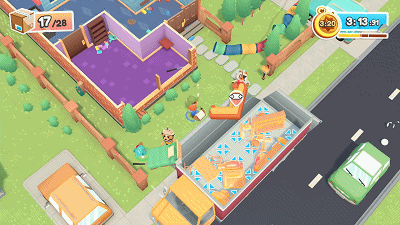 《胡鬧搬家》可提供1-4人同屏進行游戲。大家扮演的搬運工角色需要在規定時間內通過分頭行動,或者合作搬運重物的方式,把一個房子、農場、實驗室里的規定物品全部裝上車。