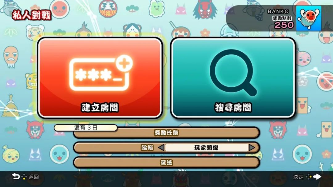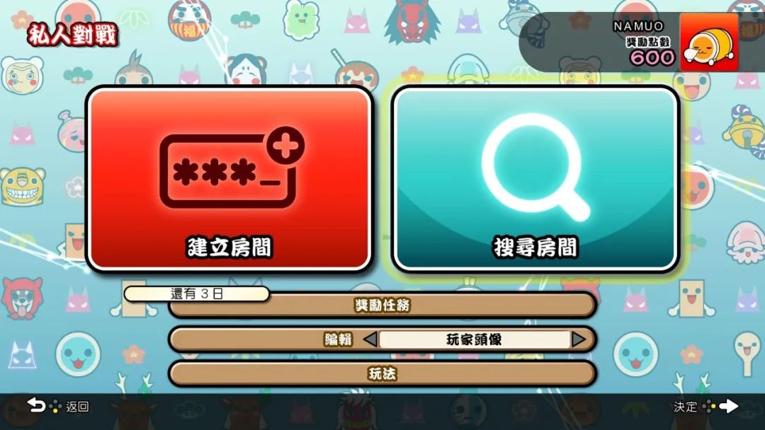 選擇「私人對戰」後,只要其中一人先在「建立房間」中自訂六位數房間密碼並分享給好友,另一人就能在「搜尋房間」中輸入密碼進行連線對戰,就算在家也能透過連線,與親朋好友享受演奏對戰樂趣。