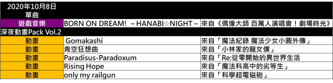 10月8日起,來自《偶像大師百萬人演唱會!劇場時光》的「BORN ON DREAM! ~HANABI☆NIGHT~」,以及來自《魔法紀錄魔法少女小圓外傳》的「Gomakashi」等在內的「深夜動畫Pack Vol.2」等追加下載樂曲現正發布中。