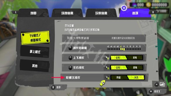 游戲開始默認為用陀螺儀模式來調整准心。打開[菜單]→[選項]界面,玩家可以在TV和掌機模式中對陀螺儀的操作靈敏度等參數進行設置。