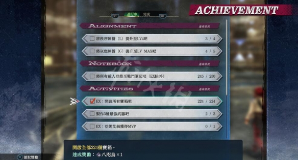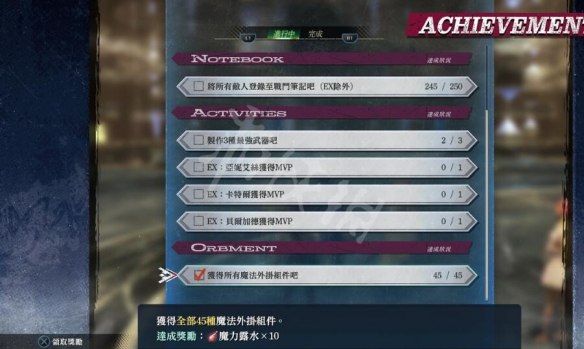 還有幾個獎盃分別是第五章選擇和結社、游擊士、黑月一起作戰,所以一周目噩夢難度玩下來,只算白金的話只有5個獎盃即第五章選擇和結社、游擊士、黑月一起作戰3個和LGC全滿1個還有人物羈絆全滿1個拿不到外,其餘都完成了。