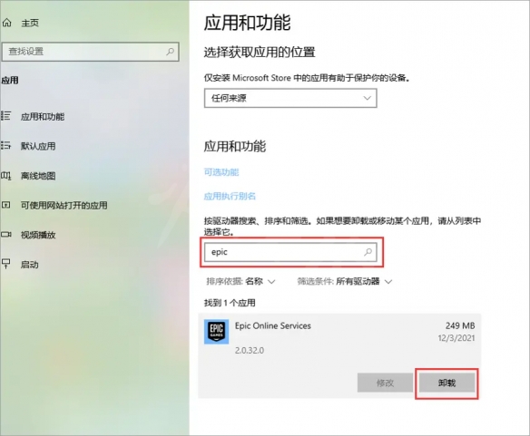 步驟2:進入設置界面,點擊應用,在應用和功能中搜索“Epic”,找到“Epic Online Services”後點擊卸載。