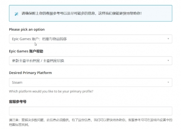 如果在啟動游戲前忘記綁定了steam賬號,啟動游戲後發現自己已經變成新號了。玩家可以找客服幫助或者前往糖豆人客戶支持網站填寫表單上傳問題需求,表單內容如下,需要提供游戲中的客服參考號。這里提供一下申訴網址,需要先登陸epic賬號。點此進入