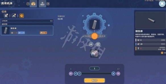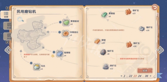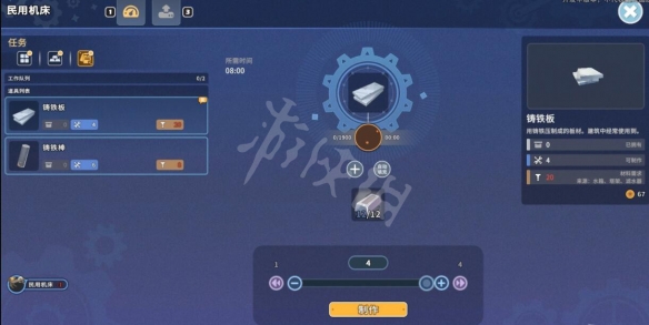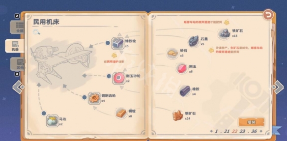 建造民用機床需要使用:鑄鐵錠*5、剛玉砂輪*2、銅制齒輪*4以及馬達*2。