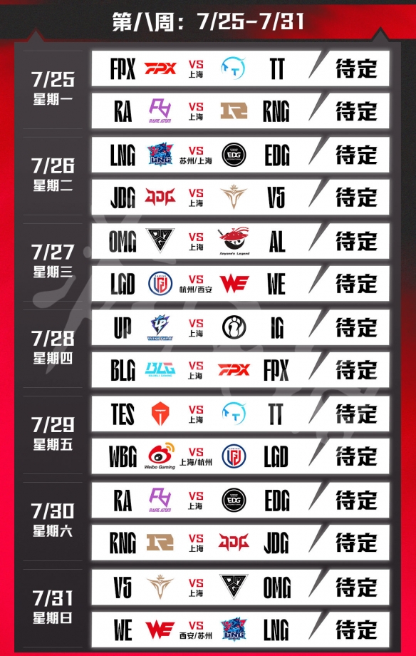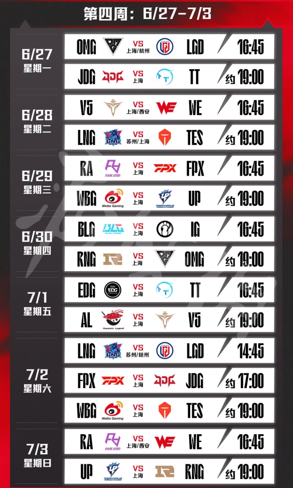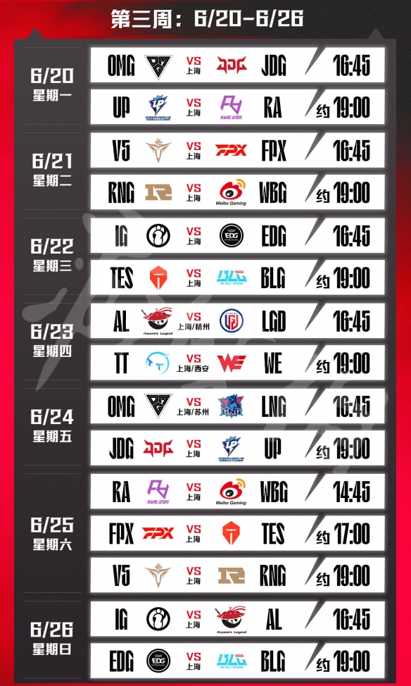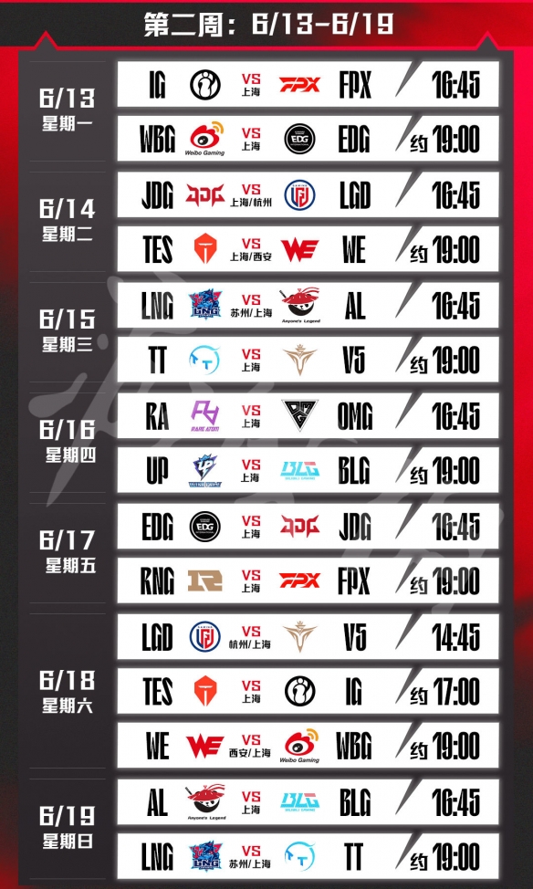 本次夏季賽常規賽分為10周進行,從6月10日開始,到8月14日結束。