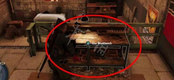 來到地圖東北部的建築內,二樓有一扇上鎖的門,打開後進去就能找到工作台,既可以用炸彈把門炸開,也可以從三樓的敵人處搶來鑰匙後再將其打開。