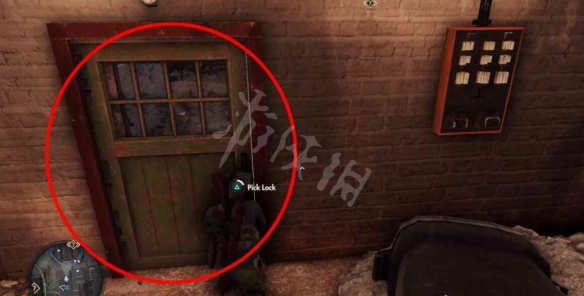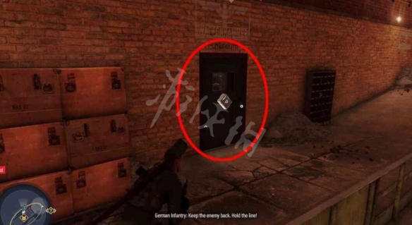 門被鎖住了,既可以用炸彈把門炸開,也可以從附近的敵人處搶來鑰匙後再將門打開。