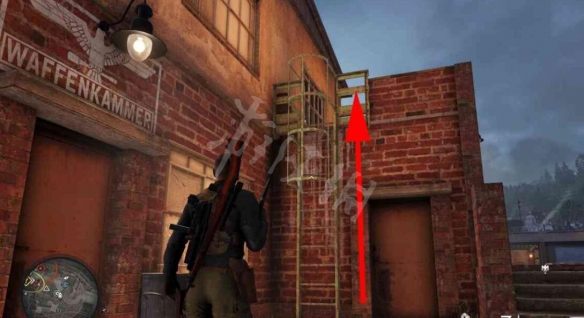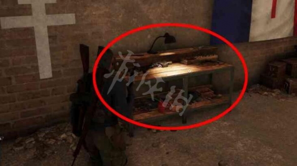 衝鋒槍工作台在主幹道東邊的建築內,從建築北邊的梯子上來,打開上鎖的門後進去,工作台就在裡面。