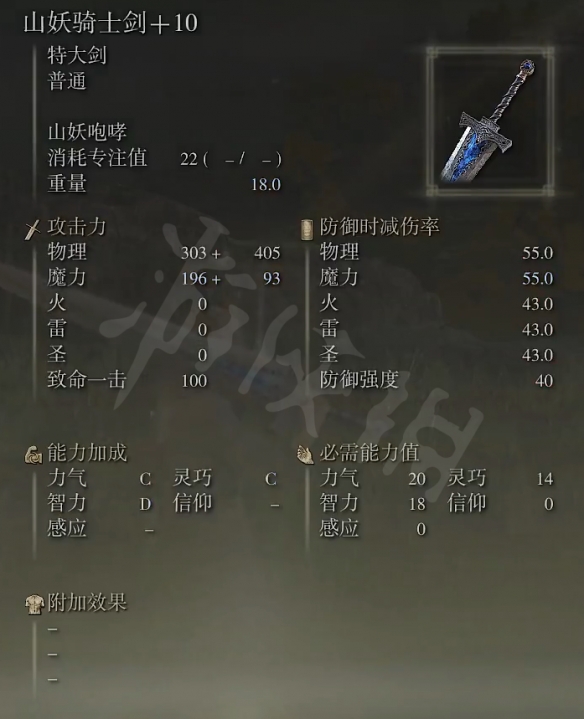 山妖騎士劍的戰技模組和山妖黃金劍相同,差別差在山妖騎士劍吃智力加成,同時有著魔力屬性。