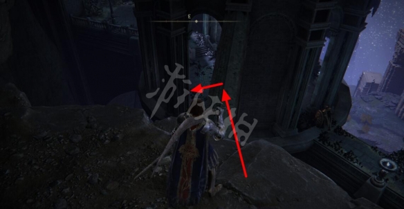 從賜福出發沿著山路前進,在前方通過斜梁進入塔中。