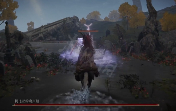 從利耶尼亞湖區域的畫家的破屋賜福點出發,沿著地圖上的大道一路向南前進,直到利耶尼亞神授塔西南方向懸崖下的小樹林,裡面有一片墓地,墓地里是一個小Boss:提比亞的喚聲船。