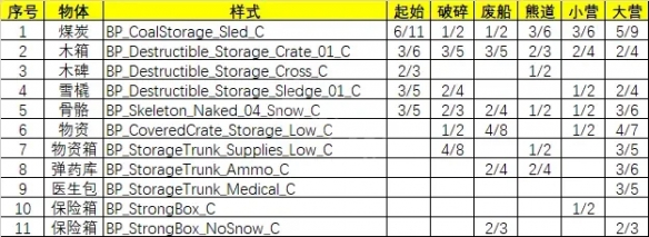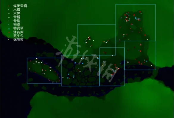 地圖包含六個區域,起始島、破碎島、廢船、熊道、小營、大營,每個區域可能刷新的物體不一致。