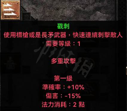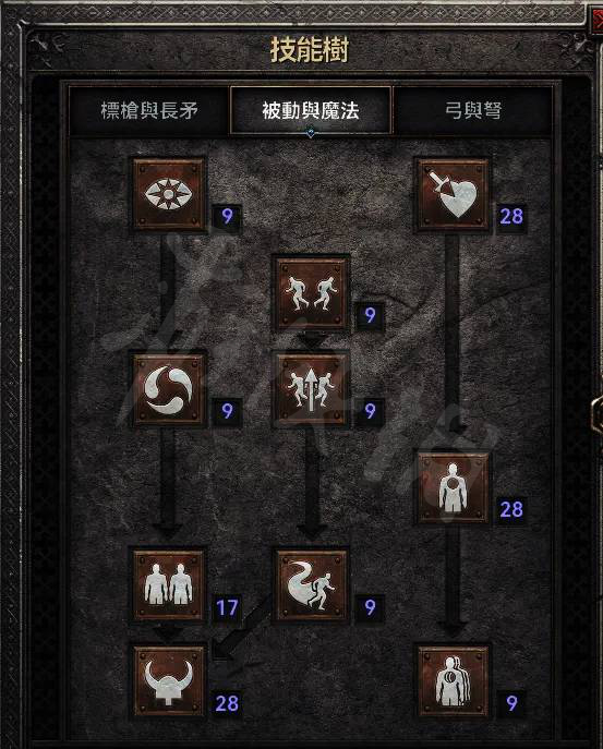 另外喜歡單刷王座的話可以點1級的戳刺,在副手武器上裝備長矛或標槍用來打巴爾,因為巴爾比較肉,弓馬在面對這種BOSS時效率比較低,裝備上的壓碎性打擊屬性對遠程物理職業效果減半,因此切換副手用近戰武器可以稍微提升一點效率,不過安全性也會降低,要不要使用也是根據自身的裝備來決定,如果穿的裝備沒有壓碎性打擊屬性就沒必要點戳刺。