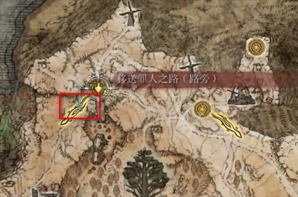 1、巨星錘這個武器的位置在【移送罪人之路(路旁)】的西南邊,下圖藍色標注點位置;