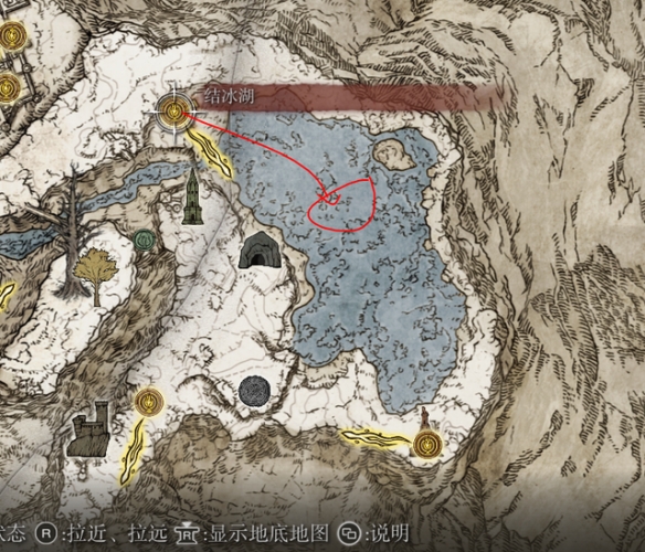 結冰湖賜福點東南方,湖面正中央,具體位置如下圖所示。