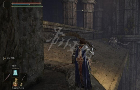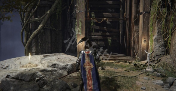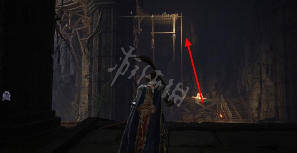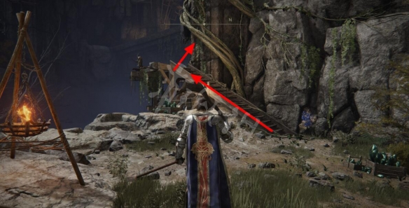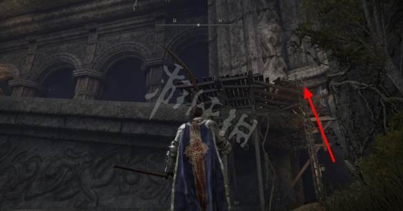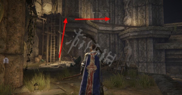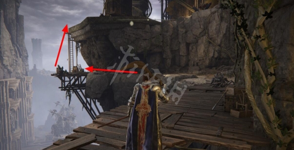 來到上方平台後向右走,通過梯子和木板到達遺跡的屋檐上。