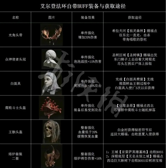 艾爾登法環遊戲中有非常多的裝備,一種有一些裝備自帶特殊效果,具體裝備名稱如下表:
