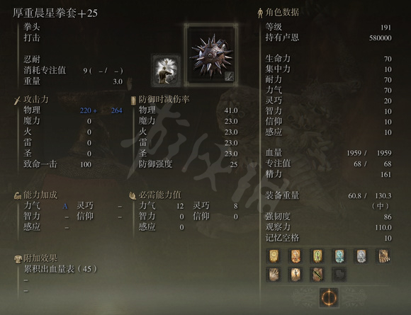 主力量加點時物理面板傷害最高的拳套,比起棘刺拳套的唯一優勢是傷害更高,缺點是削韌低,耗精也更高,打BOSS可以用用。