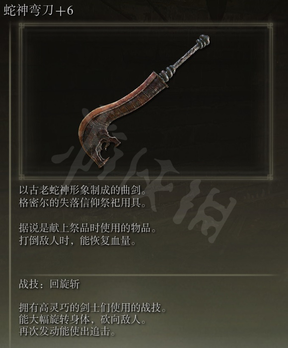 蛇神彎刀的進階版,擊殺大蛇拉卡德之後換取此武器,敵人死亡時回復血量(一個敵人回復120左右),達不到屬性要求也無所謂,回復血量的效果不會有變,背在背上就行。