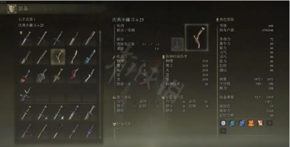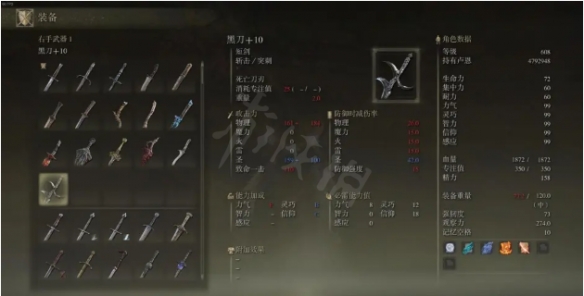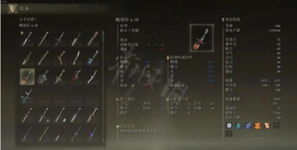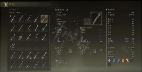 帶猩紅的武器就不用多說了,大家都被猩紅惡心過,猩紅類似劇毒,具體數值尚不詳,對BOSS貌似是固定數值?面板也還挺好的,吃靈巧,戰技是連擊,疊猩紅更快,疊上猩紅就可以換武器了。帶猩紅的武器只有四把,能上猩紅的短刀更是推薦的