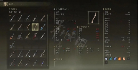 這把武器之前就有人要我測評了,強度確實不錯。智力是B補正,一把自帶魔力的武器,非附魔的情況下是最高面板短刀。法師可以拿一把這個,物理傷比魔力多一點,個人更覺得是象牙小鐮刀上位吧,面板非常高,滿點數情況下一把短刀面板600+,戰技為碎步,不錯,推薦
