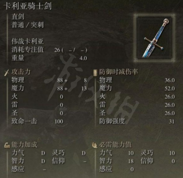 卡利亞騎士劍在諸多法師用劍中屬於面板很高的一把,同拉茲利一樣,同時享受力量、靈巧和智力三屬性加成,屬於偏中後期使用的武器之一。