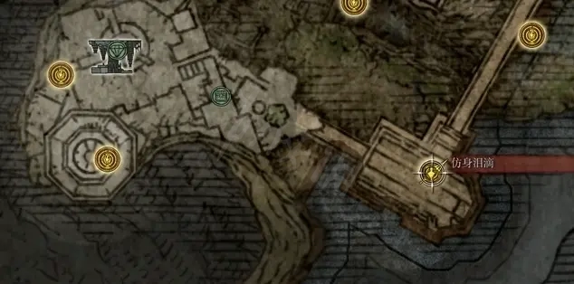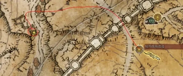 從城外戰場遺跡賜福出發,在圖中紅圈處能看到一隻抱頭蹲著的小怪。擊殺小怪後會出現一隻獅子怪,打敗獅子怪後可獲得1個淚滴幼體。