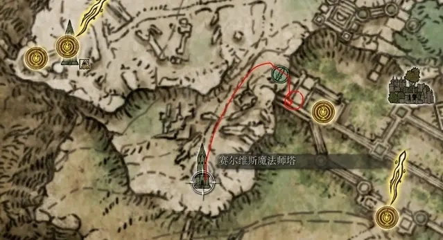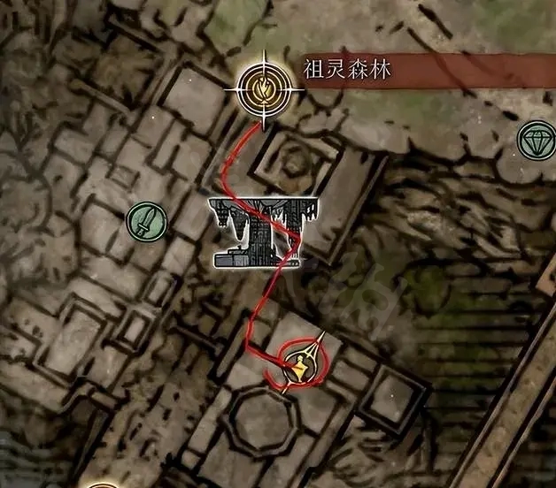 2、在利耶尼亞西北部的三魔法師塔附近,在塞爾維斯魔法師塔的圖中綠標處可以跳到城寨內的房間,裡面有一個NPC畢迪,在這里可以購買到淚滴幼體。
