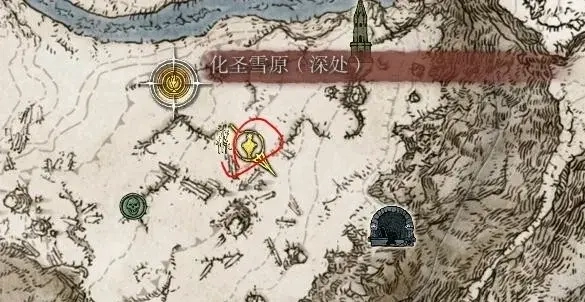 從化聖雪原(深處)賜福出發,在圖中紅圈處能看到三隻雜兵,擊殺後會出現一隻大符文熊,打敗後可獲得1個淚滴幼體。