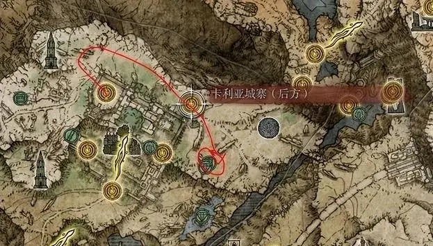 3、在利耶尼亞東側的畫家的破屋裡玩家可以獲得繪畫《再世》,獲得後需要到達利耶尼亞西北部的卡利亞城寨,穿過城寨到達圖中紅圈處。在附近找到畫家的靈魂後可獲得獎勵年幼學院套裝和1個淚滴幼體。