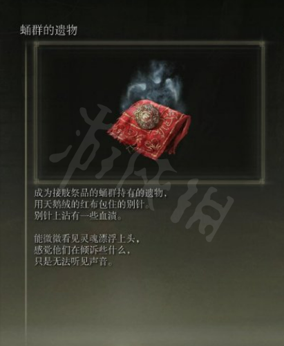 4、這個道具就是蛹群的遺物。將其拾取,回到史東薇爾城外的破屋,將其交給羅比菈塔,可以獲得一個黃金種子。之後羅比菈塔會前往大賜福,可以在那裡找她強化骨灰。