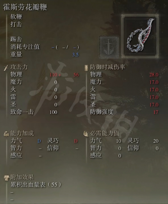 霍斯勞花瓣鞭是把顏值很高的軟鞭,擁有累積出血的特殊效果,PVE效果一般,但在PVP時相當好用。