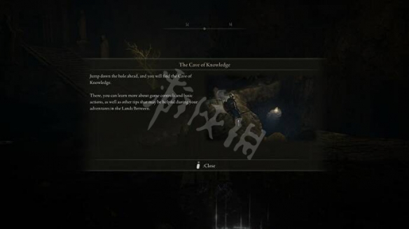 提示上寫到:“跳下前面的洞,你會發現求學洞窟,在那裡,您可以了解有關游戲控制和基本操作的更多信息,以及其他可能對您在交界地的冒險過程中有所幫助的提示”。