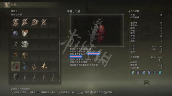 比方說紅羽七刃劍這個護符,物品說明欄顯示在HP減少時,能提升攻擊力。