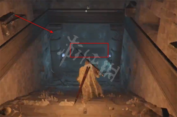 2、傳送到斷崖下的地下墓地之後,往前走到下圖指向的位置乘坐升降機下去;