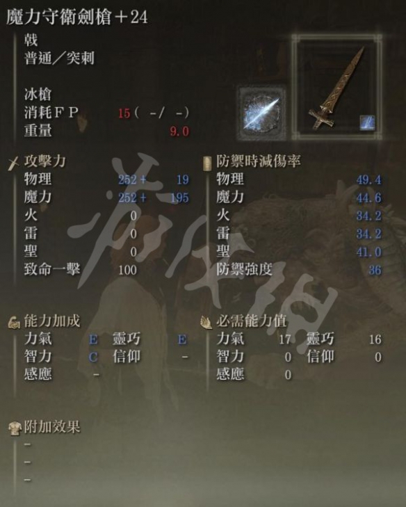 冰槍的傷害組成是純魔法傷害應該沒錯,魔力對蠍可以+15%傷害,會吃武器的面板攻擊力但不會吃屬性、效果,例如出血、中毒、凍傷,附魔雷、黑焰、血焰等都無效,自帶不小的凍傷累積,估計有兩百多(三槍山妖巨人進凍傷)。