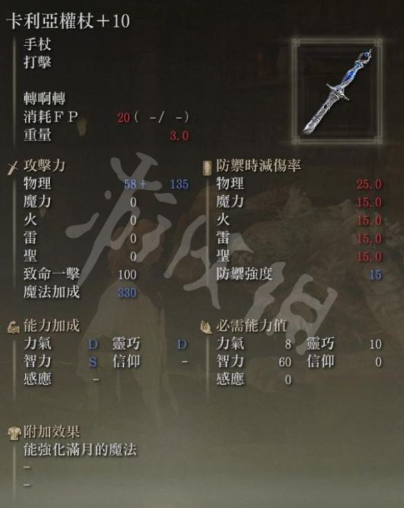有趣的是它也會被智力影響,儘管武器沒有智力補正也就是智力不影響面板,冰槍仍會增加傷害。