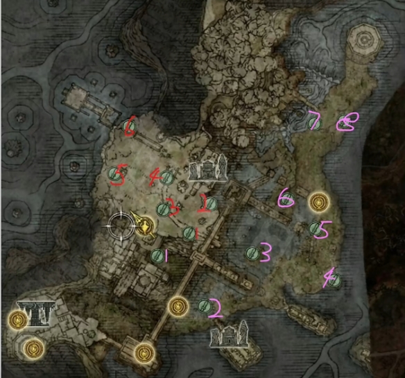 玩家首先需要找到對應的電梯才能進入希芙拉河,具體位置在霧林的黃金樹附近。圖中六個紅色數字標記的是火盆的位置,另外還有八個火炬,由紫色數字標記,點燃所有的火盆和火炬分別可以解鎖“祖靈之王”和“祖靈”的Boss戰。