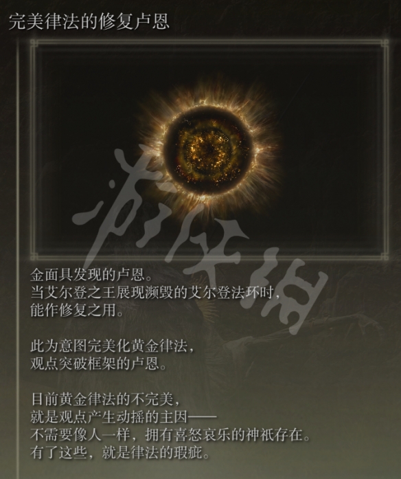 目前流傳的所謂玩家能夠達成的完美律法結局,其中的“完美”指的並不是“艾爾登之王結局的第五個分支”,而是“完美達成律法結局的通關流程”。也就是: