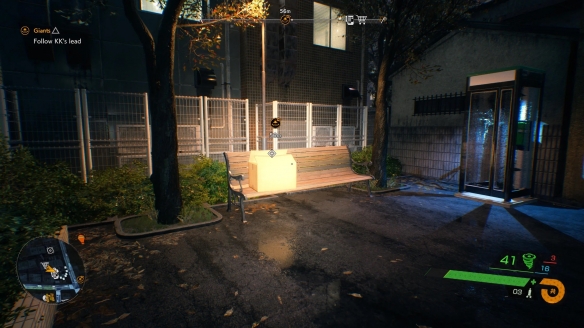 這只狸貓偽裝成一個長凳上的米色紙板箱,位於電話亭的左側。