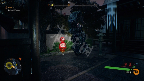 這個狸貓偽裝成兩個紅色達摩蛋疊在一起,旁邊是一個看起來像神龕的建築。