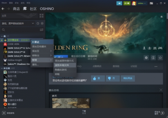 在steam中右鍵單擊艾爾登法環,單擊瀏覽本地文件,打開game文件夾,將文件粘貼到文件夾中,如圖。