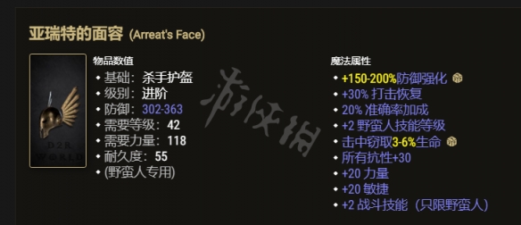 頭部最好的選擇是飛機頭——亞瑞特的面容,+2野蠻人技能等級+2戰鬥技能可以增加到僱傭兵的狂亂連擊技能,抗性+30可以提供安全性,同時也解決了近戰吸血的問題,僱傭兵只有武器,衣服,頭部三件裝備的位置,不能指望武器和衣服解決無法冰凍的問題,頭盔位置可以給亞瑞特的面容打個孔鑲嵌32號解決冰凍的問題。