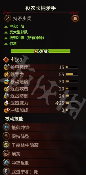 役農長柄矛手,老農矛,單看面板有點平平無奇,15護甲等於紙糊,吃滿寧和也就36近防,而且這個兵幾乎只在沒有兵營的情況下才會拉出來作數的,可以說是中規中矩的炮灰,亮點是這玩意竟然有抵禦全沖鋒,而且吃滿寧和的情況下士氣是比較穩固的,不會出現被放血鬼a上來沒幾秒就潰了的情況,但也千萬不要指望這個兵種能打出什麼作用。主要適用環境為15-20回合前震旦內戰,建議用於攻城時站點和絞肉。