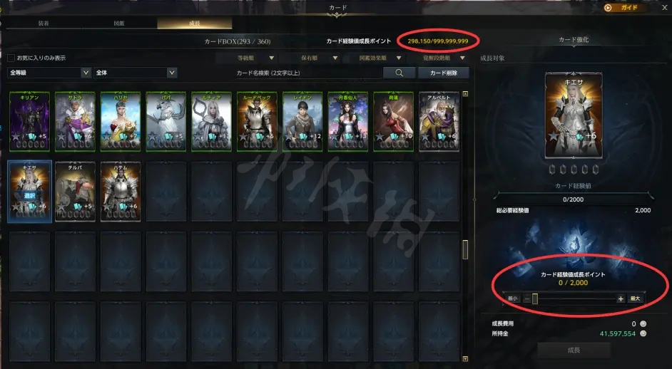 第三頁為我們所收集的所有卡片,紅框部分為卡片經驗值,特殊的經驗卡片和多餘出來的卡吃掉以後會自動轉換為經驗值,經驗值可以用來給卡牌突破。(覺醒)