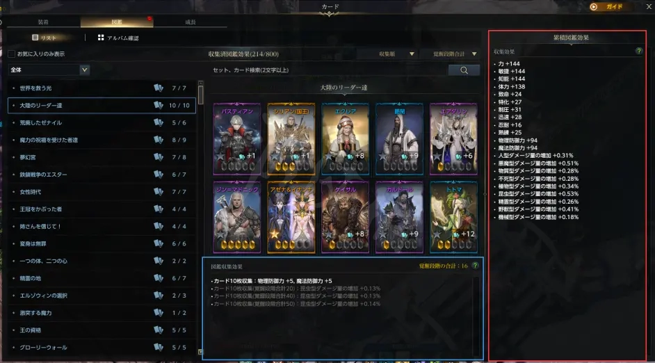 切換到第二頁我們可以看到,左邊為卡組,點擊即可查看卡組內包含哪些卡,藍色部分為此卡組可以提供給你的額外屬性,紅色部分為你所收集的所有卡提供給你的額外屬性。