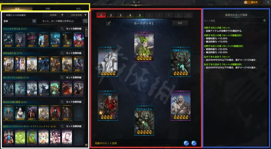 白色框為可裝備卡牌,紅色框為已裝備卡牌,藍色框為裝備卡牌所提供的效果,黃色為頁面功能切換。