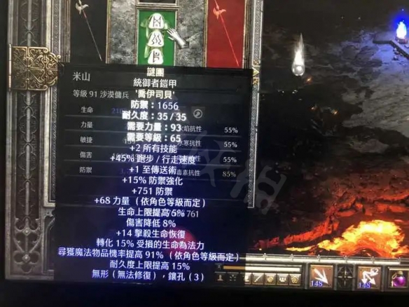安全性上,剛毅抗性幾乎是滿的,血甲除了電抗其他都是紅的,(得益於戒指有37電抗)