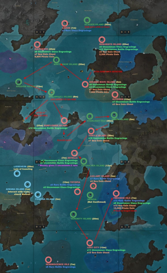 2.然後跑完任務之後直升號會送一套302裝備,接下來目標就是強化這套302,強化到全身600。強化需要材料,材料大頭是跑島嶼任務獲得,如圖綠色標記的島都要跑,給大量強化材料,紅色標記給刻印可以選擇,然後商城F4商店盡量全買。