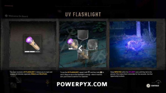 手電筒的剩餘電量會顯示在屏幕左下方,電量歸零後需要等幾秒鍾才會緩慢恢復(自動充電)。用紫外線手電筒照射殭屍就能令它們進入眩暈狀態,然後可以趁機攻擊它們。